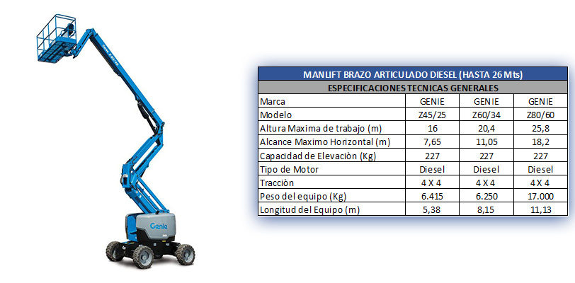 Los Manlift o Brazos Articulados con motor diésel son equipos utilizados principalmente en montajes, construcción, mantenimiento y trabajos industriales en general, con tracción 4 x 4 adecuados para terrenos irregulares y destapados, ideales para trabajos exteriores y de difícil acceso.