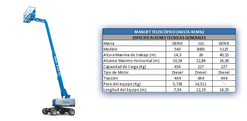 Los Manlift Telescópico con motor diésel son equipos utilizados principalmente en montajes, construcción, mantenimiento y trabajos industriales en general, en trabajos de gran altura, con tracción 4 x 4 adecuados para terrenos irregulares y destapados, ideales para trabajos exteriores y de difícil acceso.